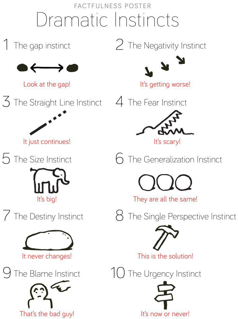 마찬가지로 속단하는 우리 뇌나 극적인 것에 열광하는 성향, 즉 극적인 본능 탓에 세상을 오해하고 과도하게 극적인 세계관을 형성한다. (…) 우리가 사는 세계에 의미를 부여하고, 하루하루를 살아가려면 여전히 그런 극적인 세계관이 필요하다. 머릿속에 들어오는 정보를 매번 솎아내고 모든 결정을 합리적으로 분석한다면 평범한 삶이 불가능할 것이다. (…) 하지만 극적인 것을 흡수하더라도 어느 정도 조절하는 법을 배울 필요는 있다. 그러지 않으면 그쪽으로 식탐이 생겨 세상을 있는 그대로 보지 못한 채 방향을 잃고 헤매기 쉽다.
