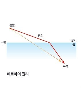 광선은 자신의 정확한 목적지가 어디인지를 알아야 해. 목적지가 다르다면 가장 빠른 경로도 바뀔테니까 (...) 또 해당 경로를 가로지르는 데 걸리는 시간을 계산하기 위해서는 그 경로 중간에 무엇이 가로놓여 있는지, 이를테면 수면이 어디 있는지 하는 식의 정보도 필요해.