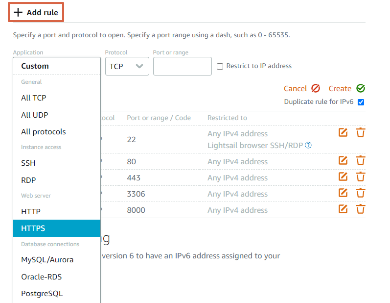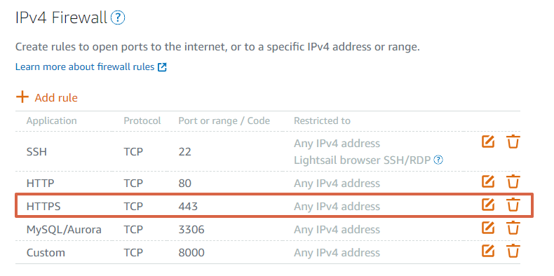 운영하고 있는 사이트에 SSL 인증서를 적용하고 https로 접속을 하려고 하니 사이트를 찾을 수 없다고 오류가 발생했다. 아무리 찾아보아도 SSL 인증서 적용은 올바르게 다 한 것 같은데, 계속 접속이 되지 않아 삽질을 많이 했다. nginx의 access.log와 error.log에도 아무런 로그가 남지 않아서 방화벽을 의심하던 중 혹시나 싶어서 Lightsail에서 자체적으로 설정하는 것이 있는가 해서 들어가보았다. 그리고 다행히 Lightsail에서 설정을 해주는 것이 맞았었다. Lightsail 말고도 다른 클라우드 서버를 사용하는 사람들 중에 https로 접속이 되지 않는 사람들은 클라우드 서버 자체 설정을 확인해보기를 바란다.